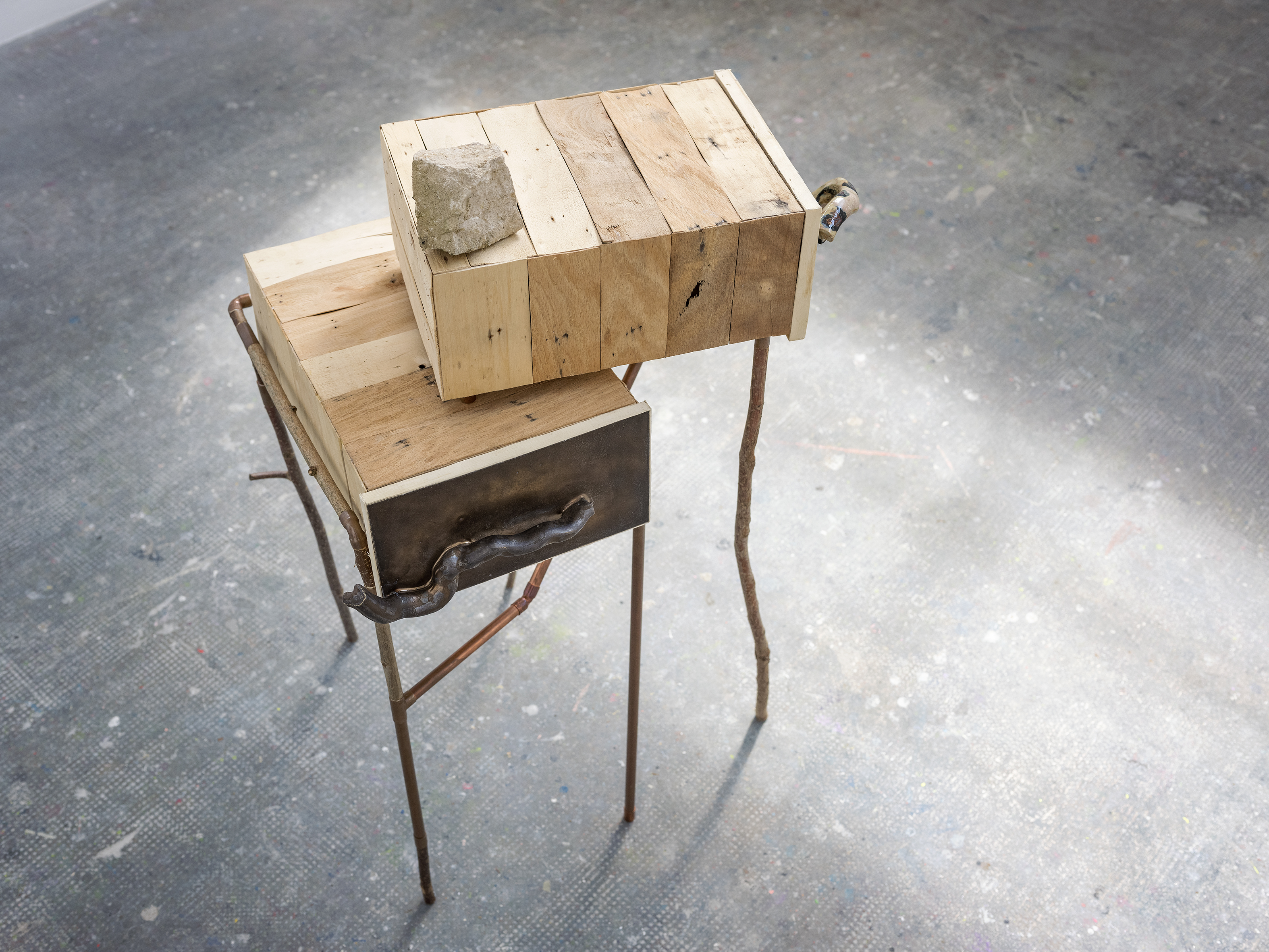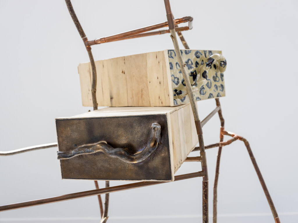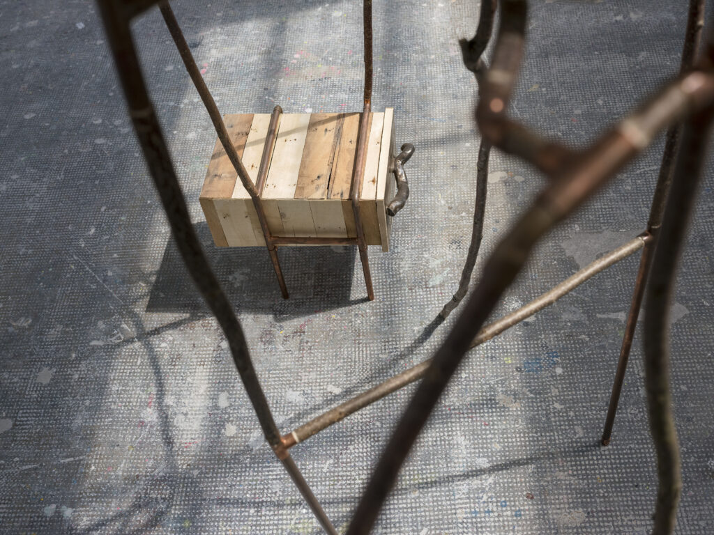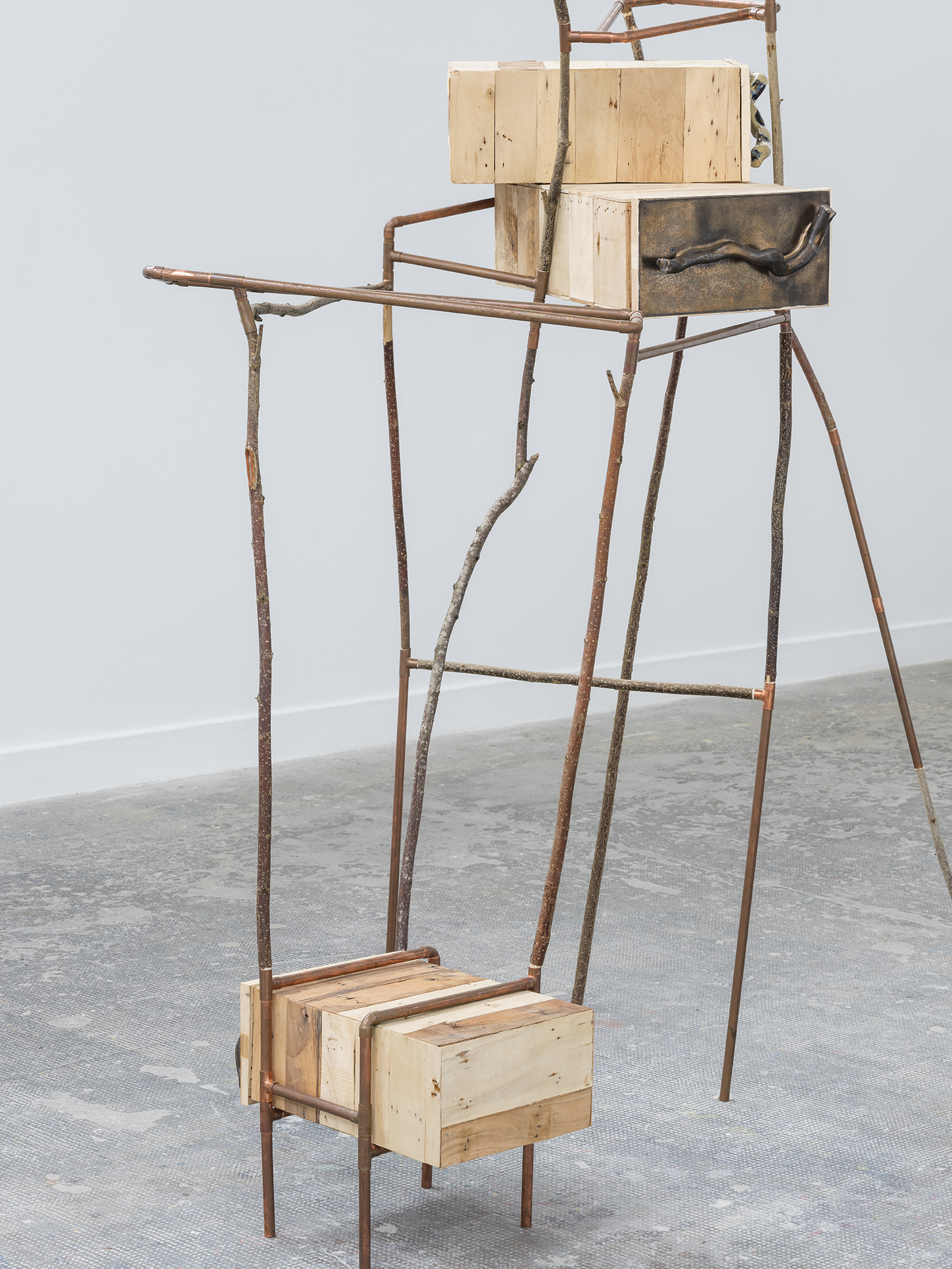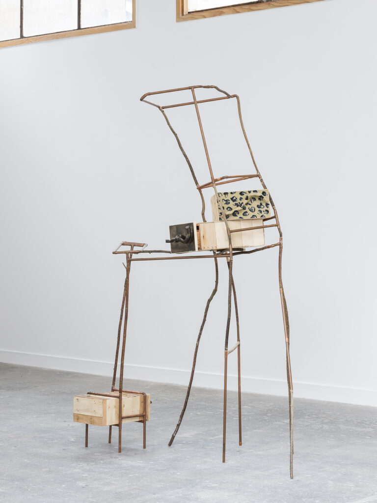 La grande et la petite – noisetier, cuivre, céramique, bois de cagettes – 2021