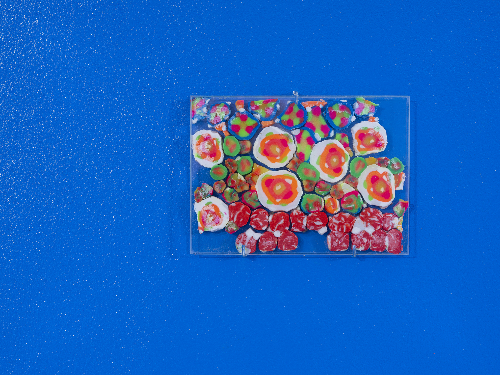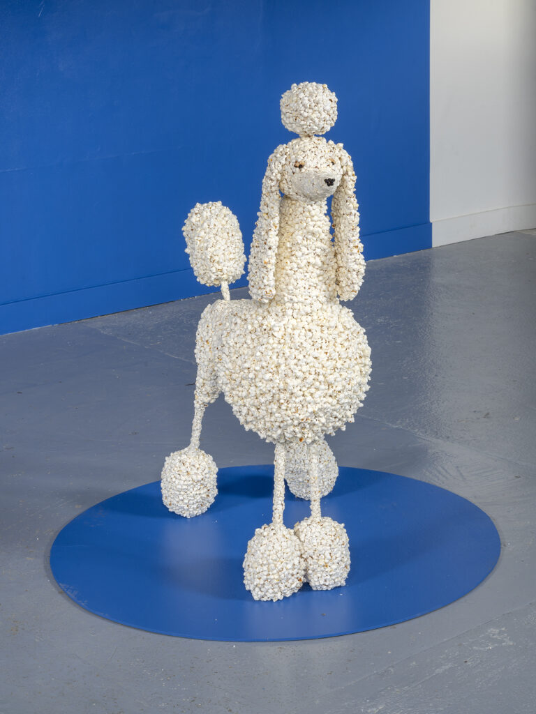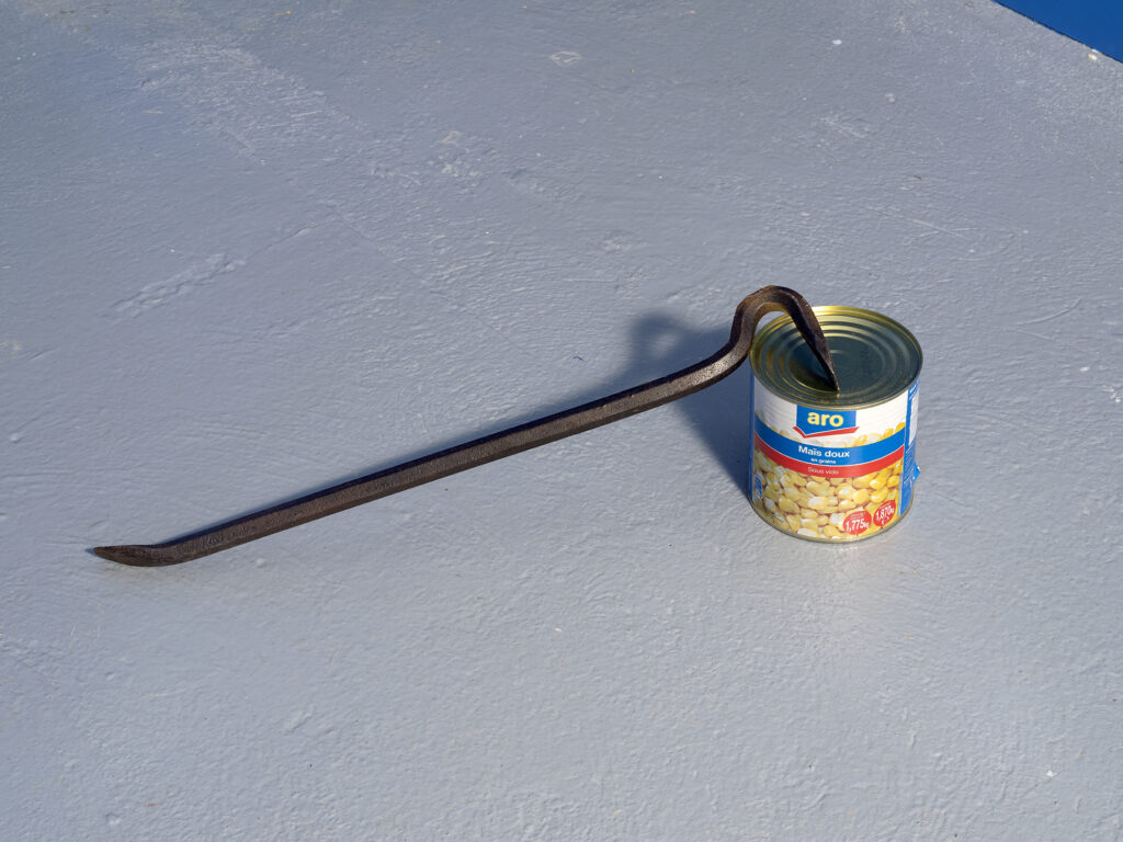 matérialité puis existe : l’inverse d’un mirage, une prophétie auto-réalisante. Cet agencement d’une boite de maïs et d’un pied de biche dont le mouvement contenu semble dire << Ouvrez-moi par effraction cette boite car on crève de faim ici ! » Que se passe-t-il sous les fenêtres des hôtels de luxe décrépis le long de la riviera? Rêve-t-on toustes du même bleu?