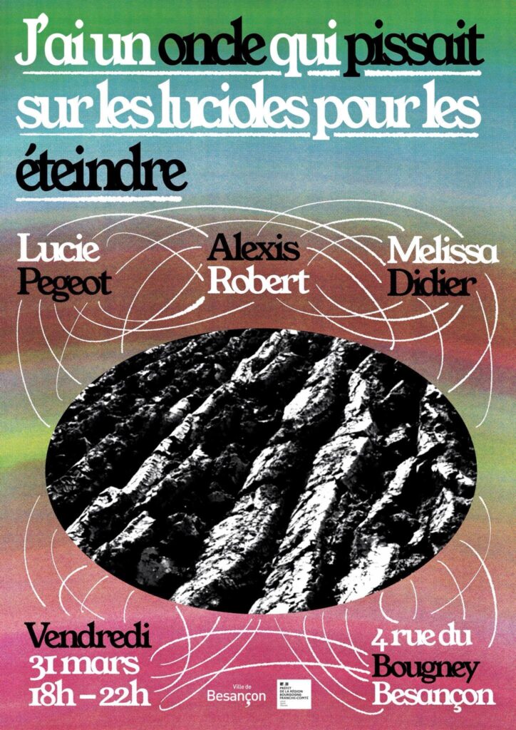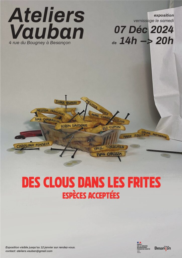 Cette exposition est le résultat d’un temps de travail commun des artistes Ivan Carozza, Ivan Chavaroche, Eli Cumin, Robin Davourie, Mélissa Didier, Mélissa Franchini, Céline Notheaux, Lucie Pegeot, Vincent Richard.