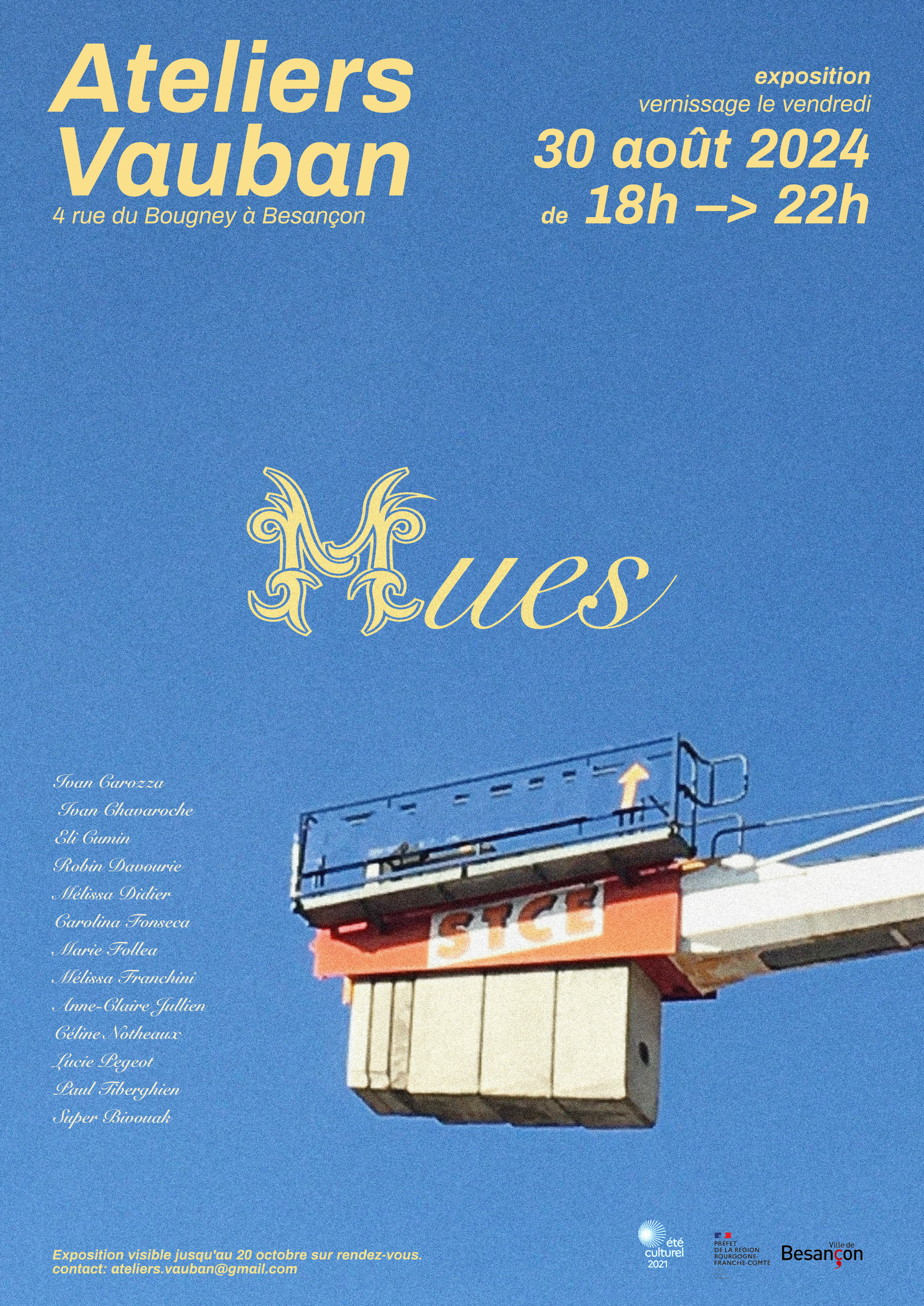 Ainsi vous pourrez découvrir les propositions de 12 artistes des ateliers lors de cette résidence estivale: Ivan CAROZZA, Ivan CHAVAROCHE, Eli CUMIN, Mélissa DIDIER, Carolina FONSECA, Marie FOLLEA, Mélissa FRANCHINI, Anne-Claire JULLIEN, Céline NOTHEAUX, Lucie PEGEOT, Paul TIBERGHIEN et SuperBivouak.