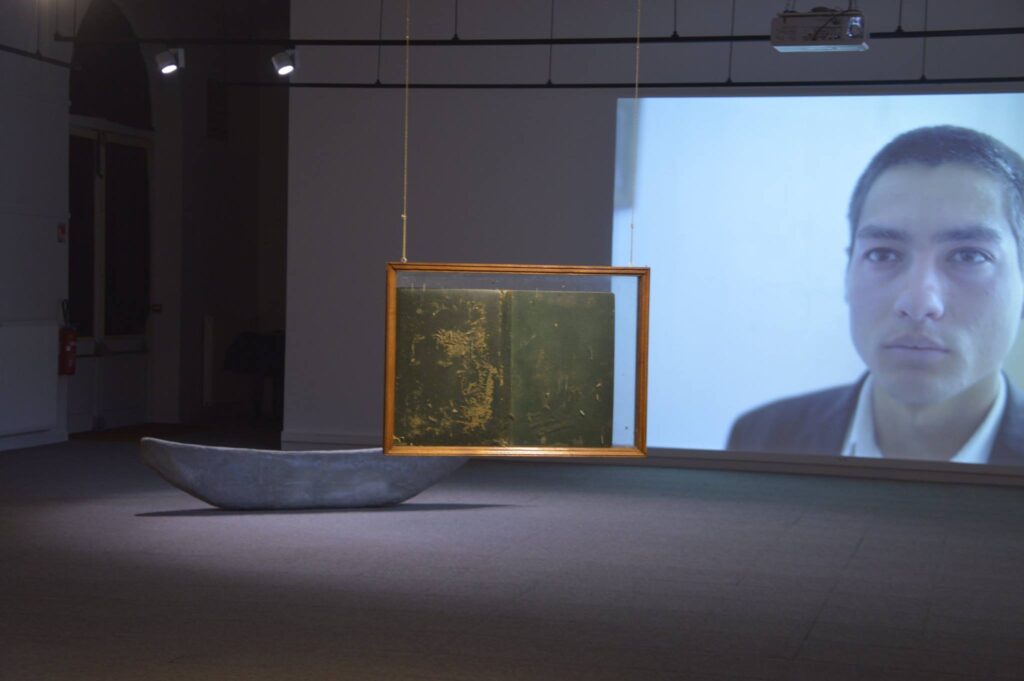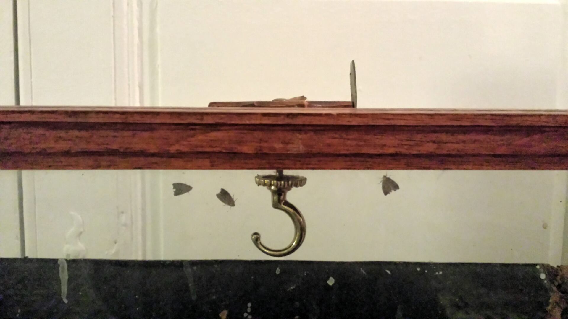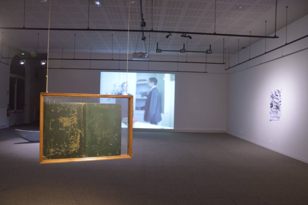 Des mites sont venues visiter mes placards, ont dévoré une pochette à dessin qui contenait des plaques de cires d’abeilles. Placées en vitrine pour l’exposition, elles ont continué leur vie, les larves ont dessiné un motif en mangeant la couverture de la pochette.